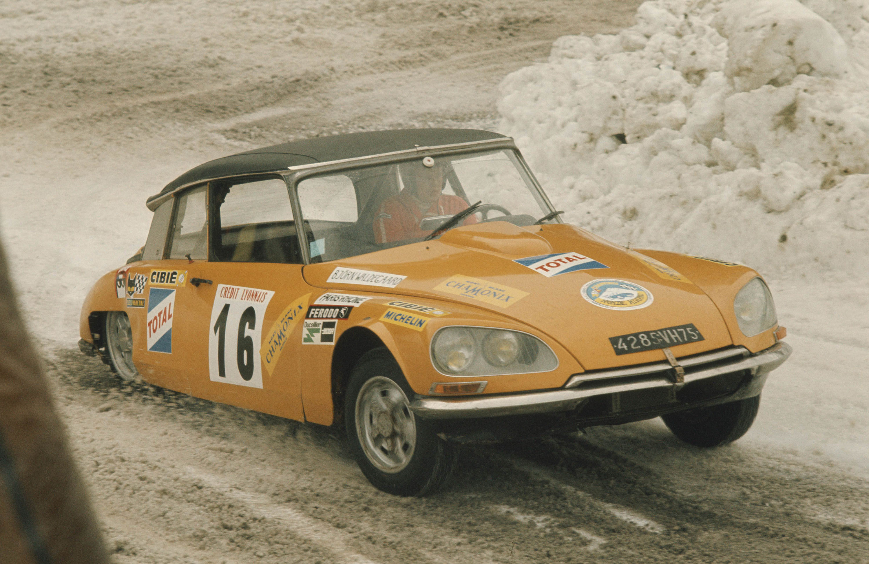 Ce coupé DS à moteur SM Maserati, confié au suédois Björn WALDEGARD, termine 2e de la Ronde hivernale de Chamonix en 1972 après avoir parcouru les trois quarts de la course sur trois pneus, le quatrième (à l'avant) ayant déjanté en virage.